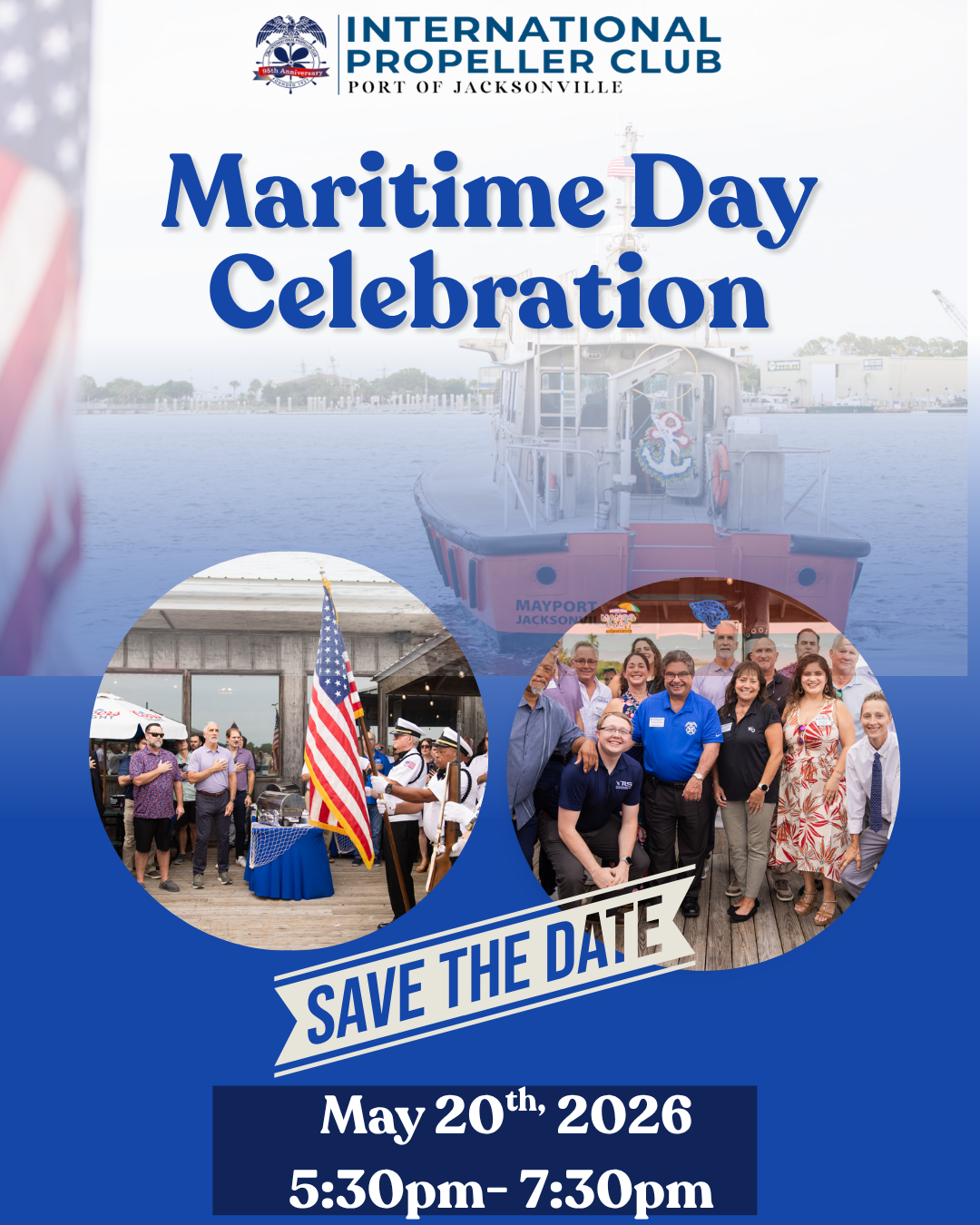 National Maritime Day is a United States holiday created to recognize the maritime industry. It is a day of national pride, observed on May 22, the date in 1819, when the American steamship Savannah set sail from Savannah, Georgia, on the first transoceanic voyage under steam power. The Propeller Club organizes a Social Networking Event, including reading the Mayor's Proclamation and Honoring those lost at sea by presenting a wreath to the waters. It's a day to celebrate our industry's rich history and shared commitment to its future.